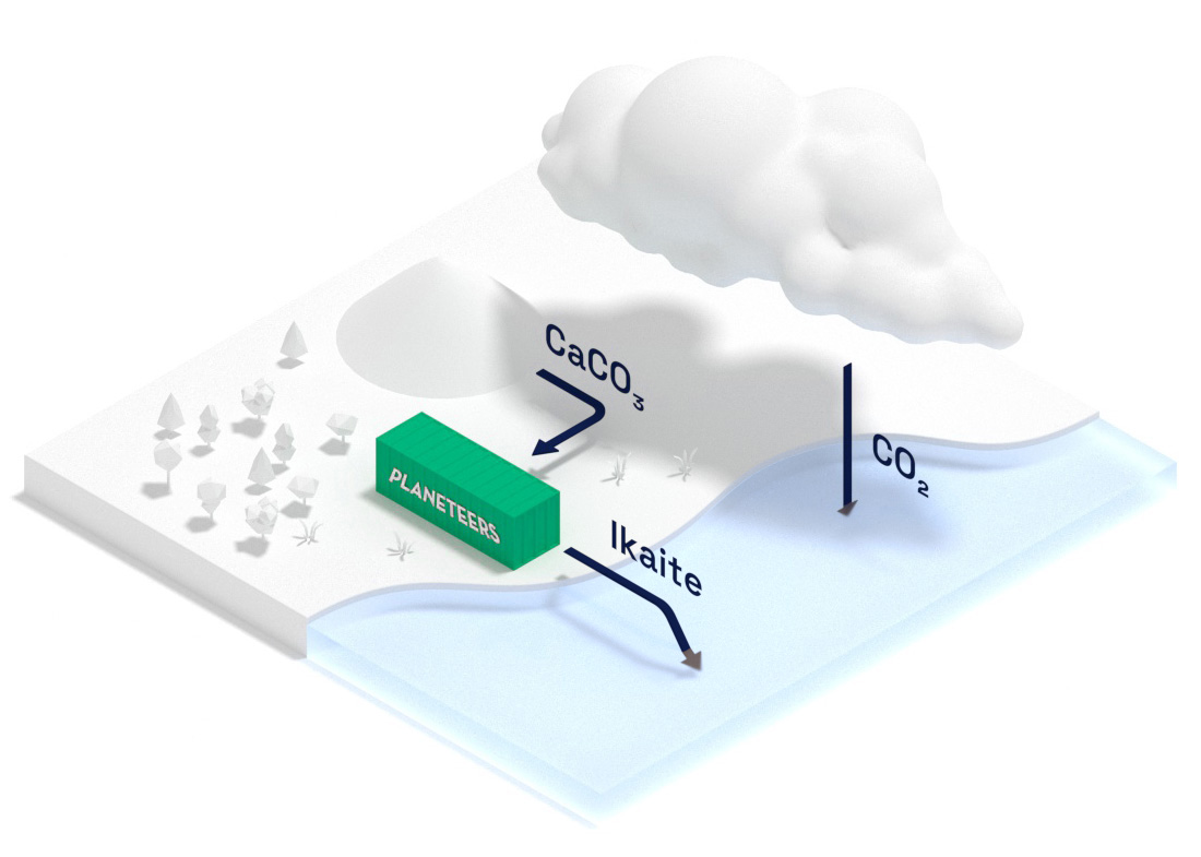 Mineral compounds (ikaite) are produced through Planeteers’ patented HCM technology and released into marine environments to increase ocean alkalinity, allowing seawater to absorb and store additional atmospheric CO₂. This controlled pathway enables large-scale, permanent, and verifiable carbon storage in the ocean.