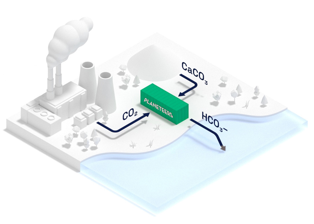 CO₂ is captured directly from industrial sources and converted into dissolved bicarbonate using limestone and water, preventing emissions and enabling permanent, verifiable carbon storage. The process is based on Planeteers’ patentpending technology, designed for scalable integration and long-term monitoring.